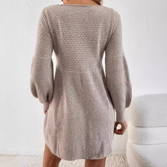 Robe Tricotée à Manches Lanternes et Taille Haute
